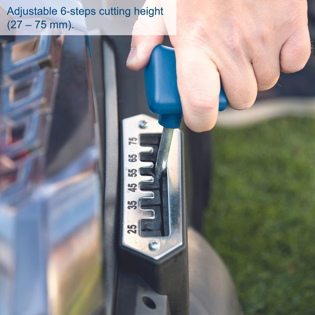 Central cutting height adjustment with 6 levels ranging from 25 to 75 mm