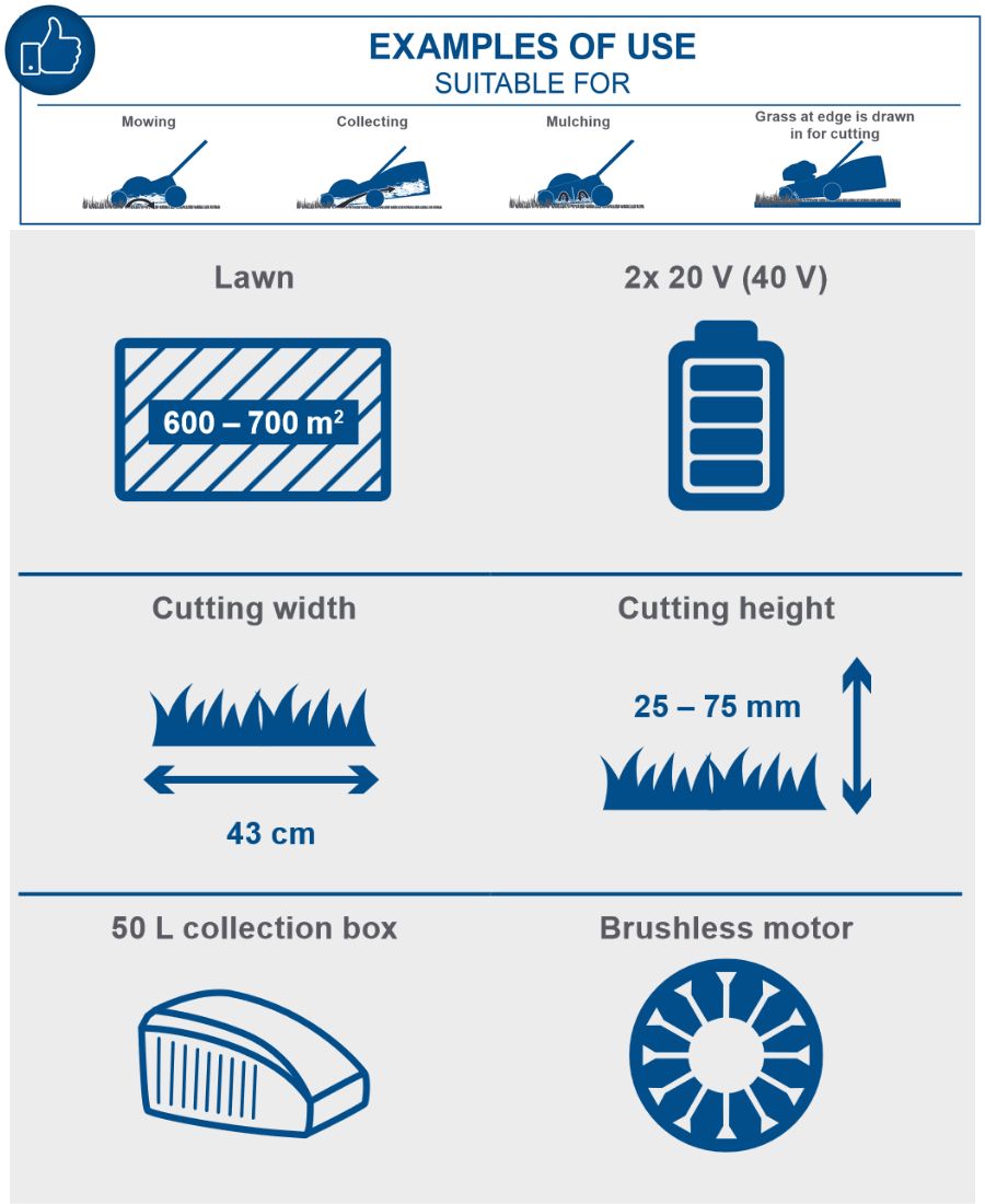 Powerful cordless lawn mower with a 43 cm cutting width and 4-in-1 function: mowing, collecting, mulching, and lawn edge retraction