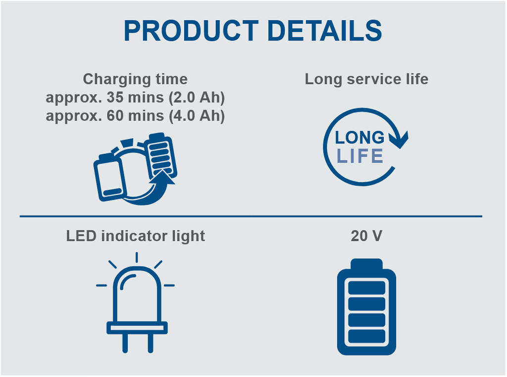 4.5A Charges batteries quickly – 2.0 Ah battery: about 35 mins charging time /