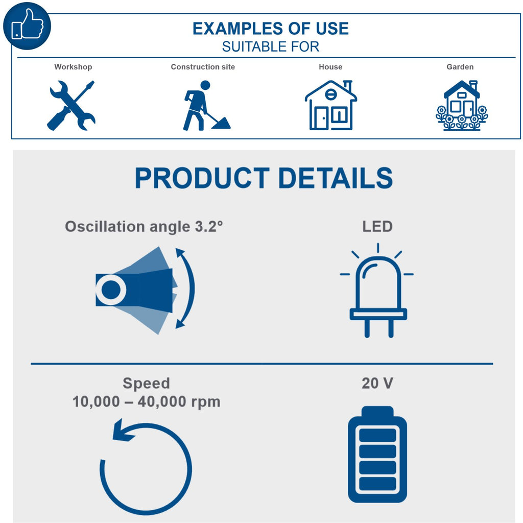 Includes 1x saw blade for plunge cuts, 1x diamond saw blade, 1x scraper, 1x delta sanding plate, 1x adapter for external dust extraction, 9x abrasive discs for timber,1x angle adapter