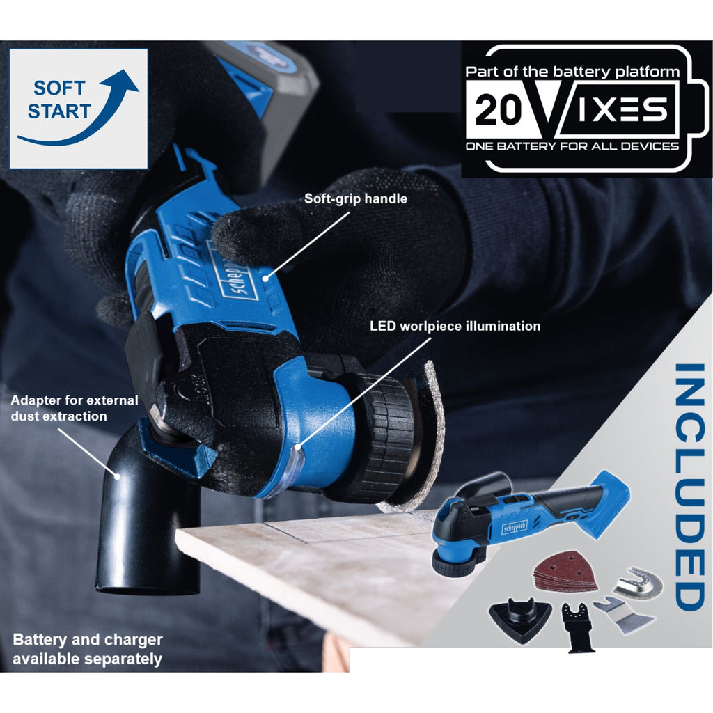 Compact cordless multi-functional tool with versatile oscillation technology for sawing, cutting, scraping, sanding and grinding