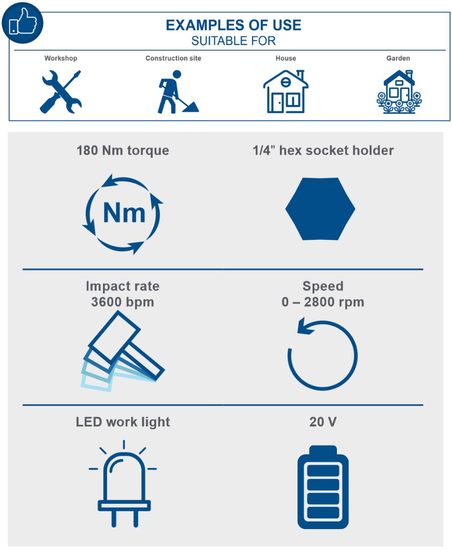 | Model | Scheppach 20V Cordless Impact Wrench C-ID180-X |