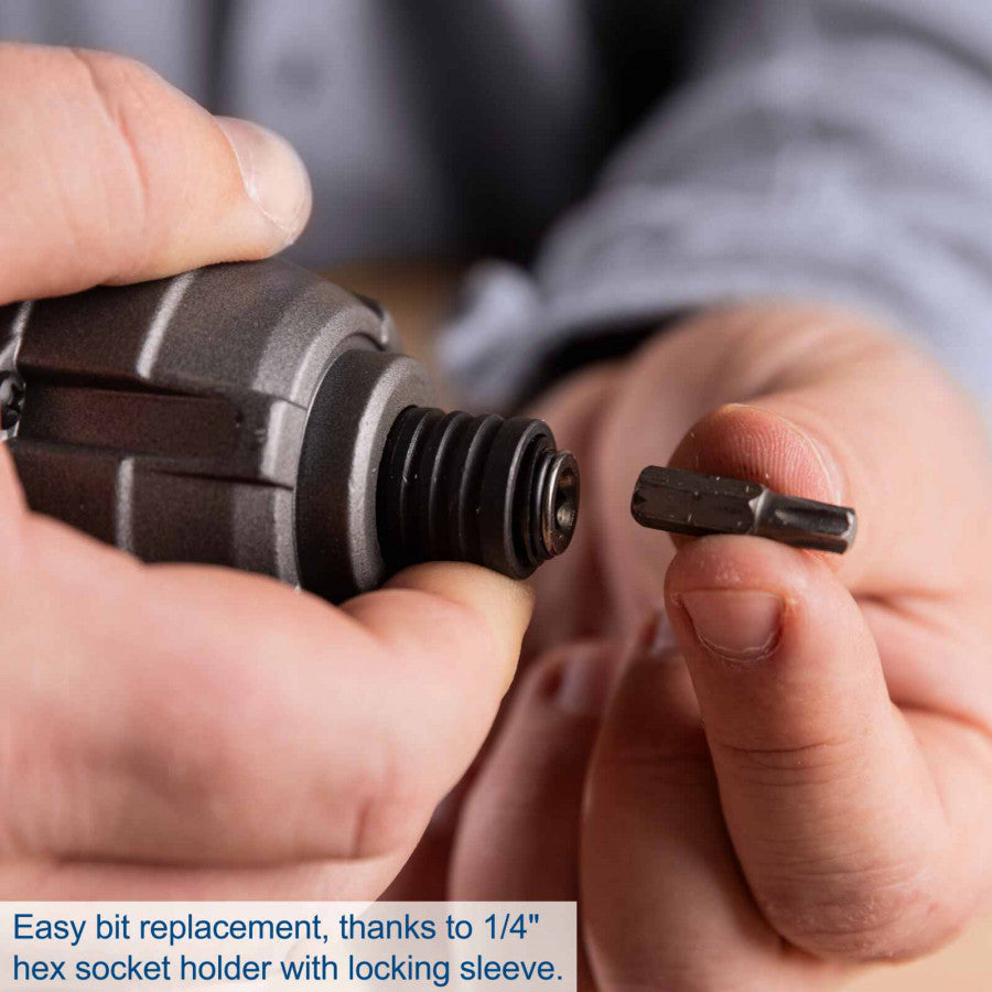 Easy bit change with ¼ inch hexagon socket and locking sleeve
