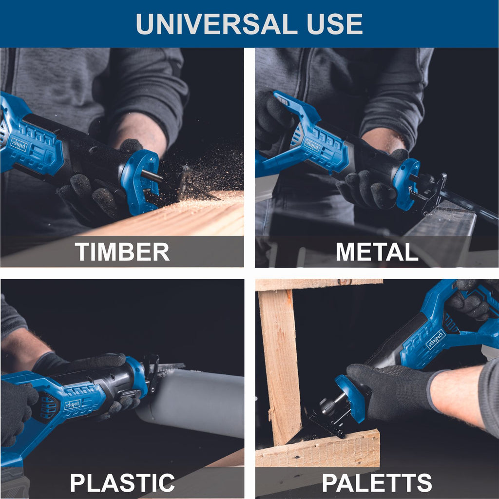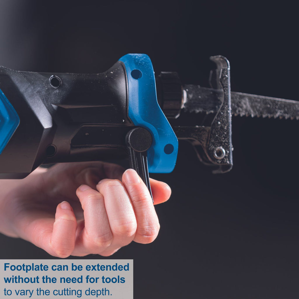 Powerful cordless reciprocating sabre saw for cutting timber, plastic, non-ferrous metals and building materials (when using the appropriate saw blade)