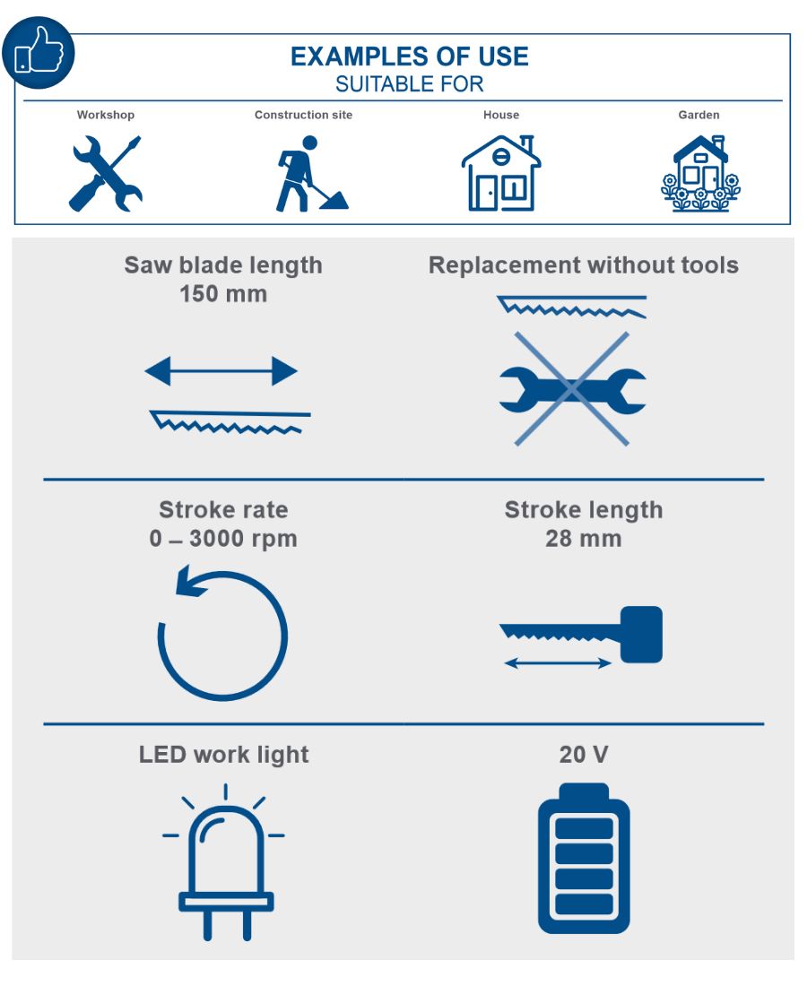| Max. cutting depth | 115 mm (timber), 20 mm (soft metal), 90 mm (pipe) |