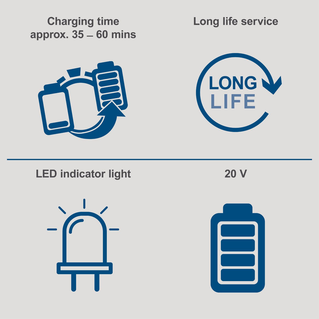 Charging time approx. 35-60 min (2.0Ah battery) depending on charger