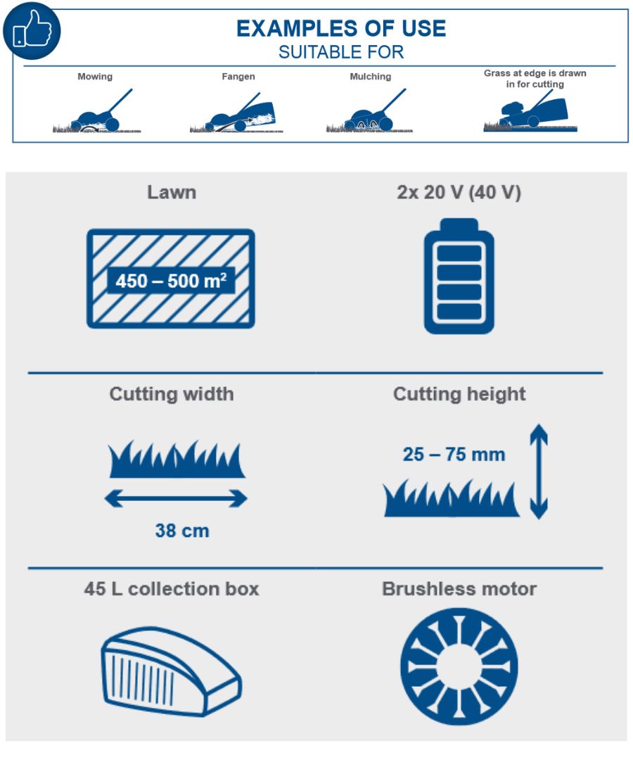 High-performance cordless lawn mower with a cutting width of 38 cm and 4-in-1 function: mowing, collecting, mulching, drawing in grass at the edge for cutting