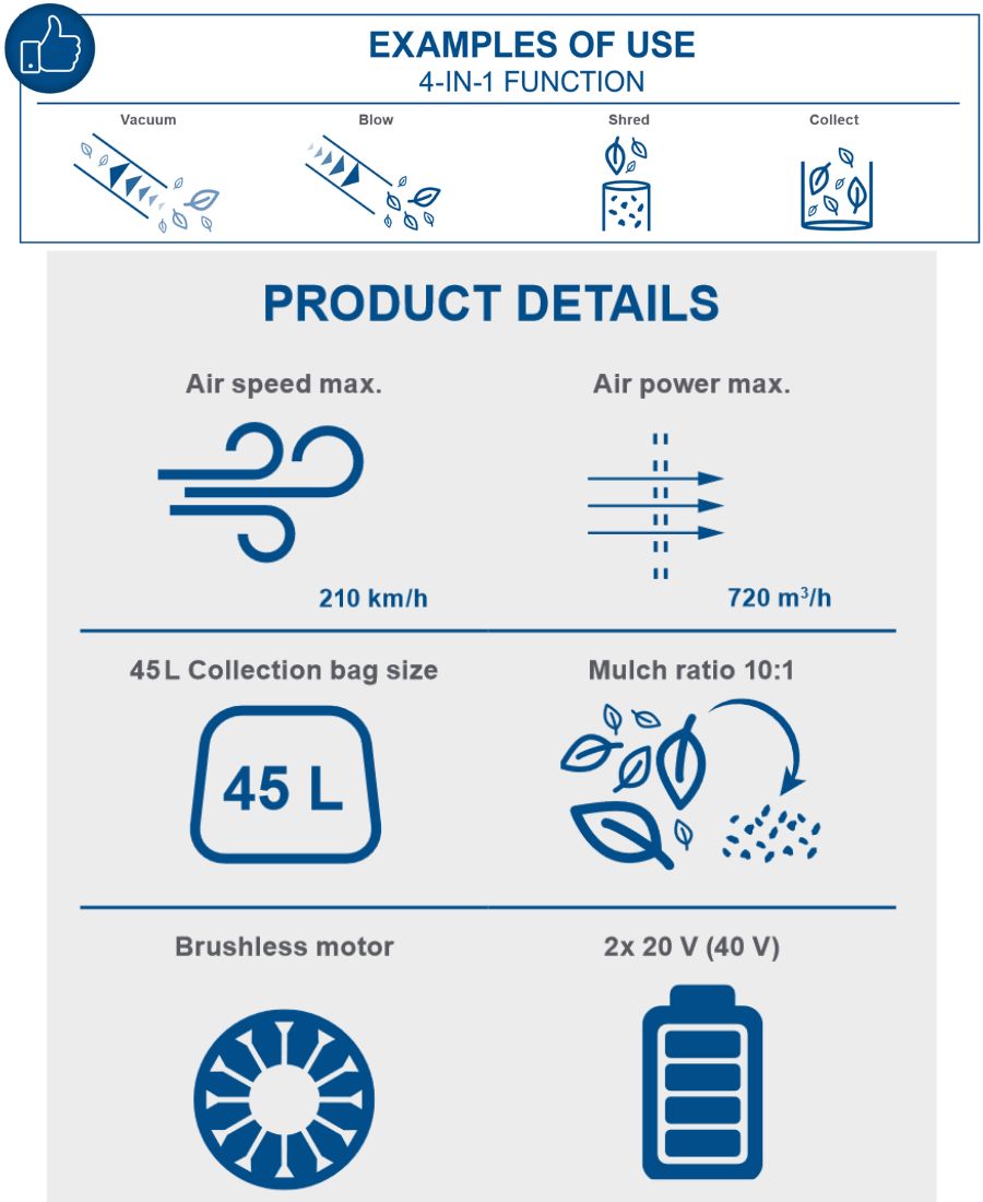 Powerful cordless leaf blower with 4-in-1 function: vacuuming, blowing and shredding function, plus integrated collecting bag